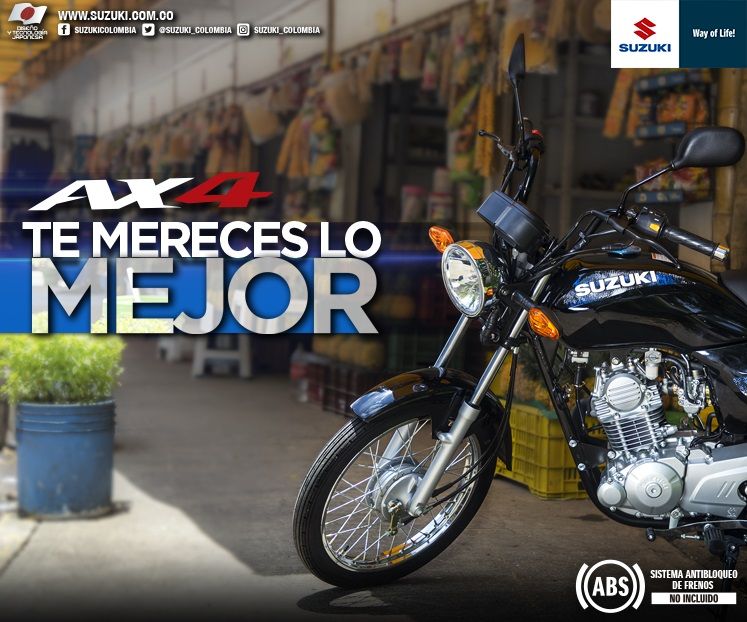 Suzuki Motor de Colombia S.A. se reserva los derechos a cambios sin previo aviso, en equipos, especificaciones, colores, materiales, y otros; para aplicaciones en condiciones locales. Cada modelo podría ser descontinuado sin previo aviso. Por favor consulte con su distribuidor local para detalles de algunos de esos cambios.